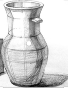Задание 2 (повторение)-- на листе формат А3 изобразить один из предметов, выбранных ранее, построив овалы по горизонтальным осям (предмет ниже линии горизонта). Самостоятельно задать направление освещения, путем анализа формы и анализа направления света выделить зоны света, тени, полутени.