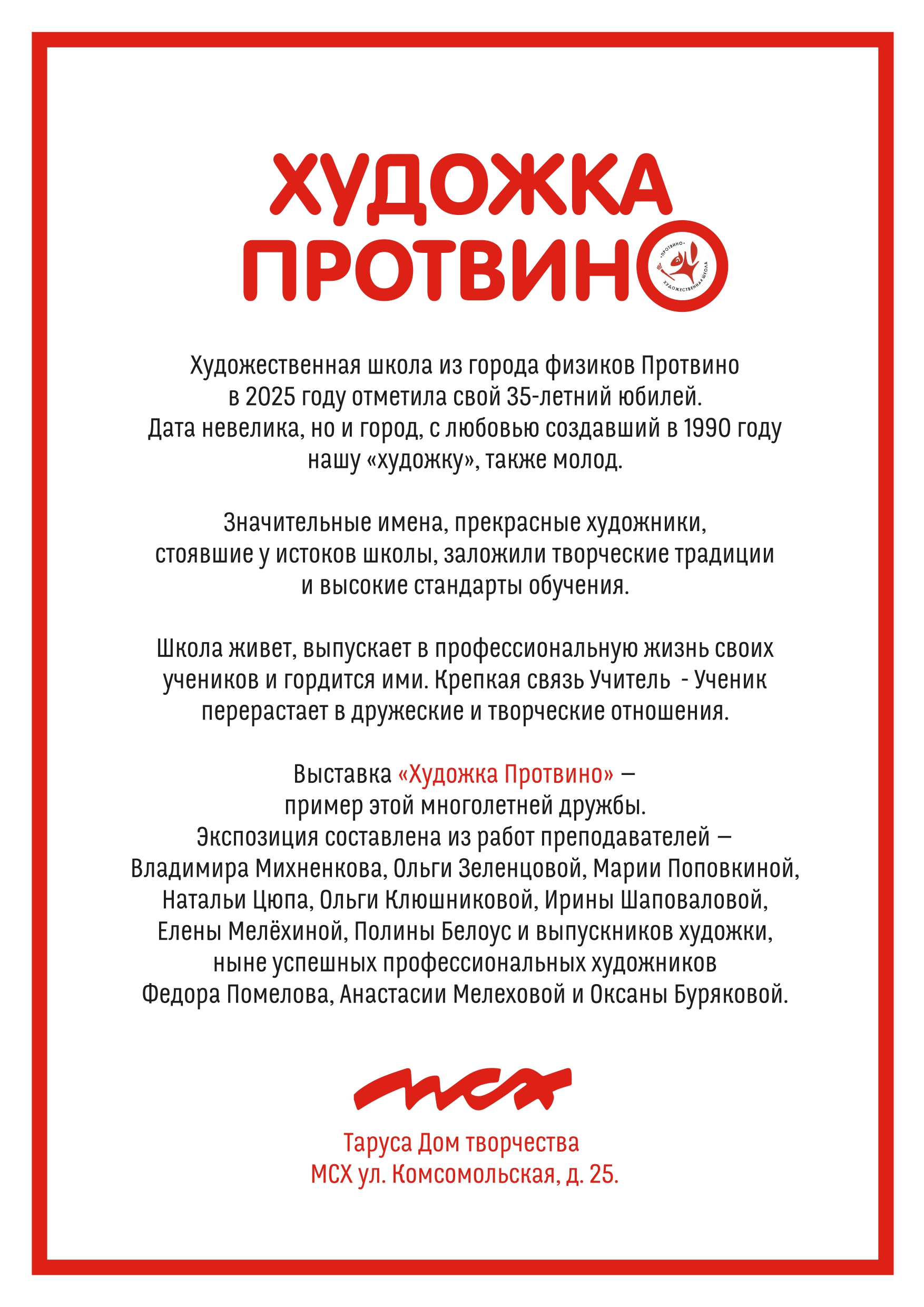 Многие участники с теплотой вспоминали годы учебы в художественной школе, учителей, которые дали им путевку в профессиональную жизнь. Преподавателям, внесшим огромный вклад в дело воспитания и образования детей и молодежи, ушедшим в разное время, посвящена на выставке мемориальная стена. Она напоминает протвинцам о замечательных мастерах – художниках и педагогах - Николае Матвеевиче Станиславском, Владимире Еремеевиче Гвоздюке и Игоре Станиславовиче Фоменко. Им на смену приходят новые преподаватели, также выпускники протвинской художки, продолжатели наших традиций.