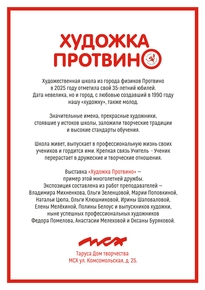 Выставка открыта в часы работы Выставочного центра Протвино и будет работать до 6 ноября 2025 г.
